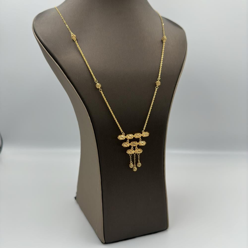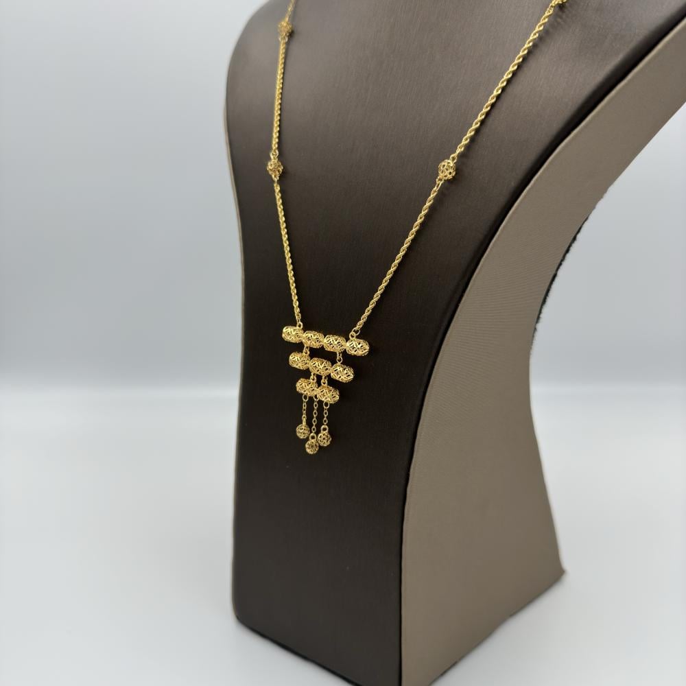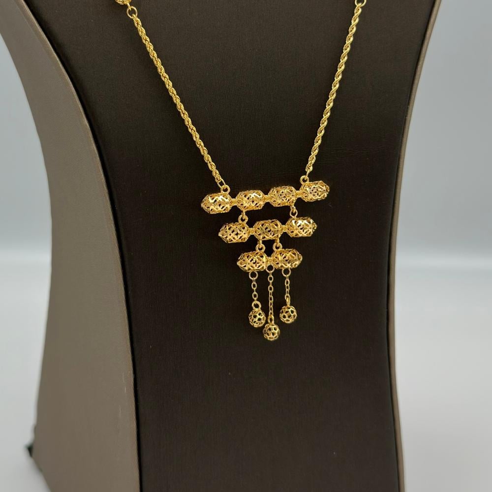 صُمم عقد ذهب عيار 21 ليضيف سحرًا وأناقة إلى إطلالتك بوزن 5.57 جرام. إضافة مثالية لخزانة مجوهراتك، حيث يعكس الفخامة والتميز. سيجعلك هذا التصميم الأنيق تبدين مميزة وجذابة في جميع الأوقات.
