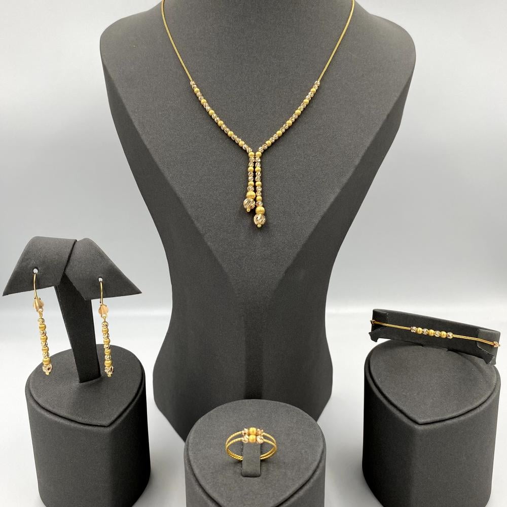 هذا الطقم الفاخر مصنوع من ذهب عيار 21 وبوزن إجمالي يبلغ 17.8 جرام. يتميز بتصميمه الراقي الذي يضفي لمسة من الفخامة على إطلالتك، مما يجعله مثاليًا للمناسبات الخاصة والاحتفالات.