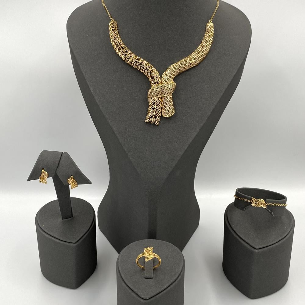 يتميز هذا الطقم الفاخر بتصميمه الراقي والمميز، مصنوع من ذهب عيار 21 وبوزن إجمالي يبلغ 16.67 جرام. يُضفي الطقم لمسة من الفخامة على إطلالتك، مما يجعله الاختيار المثالي للمناسبات الخاصة والاحتفالات.