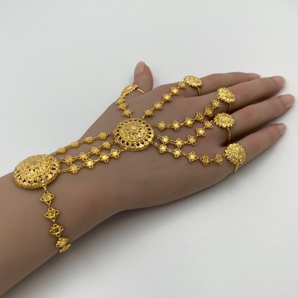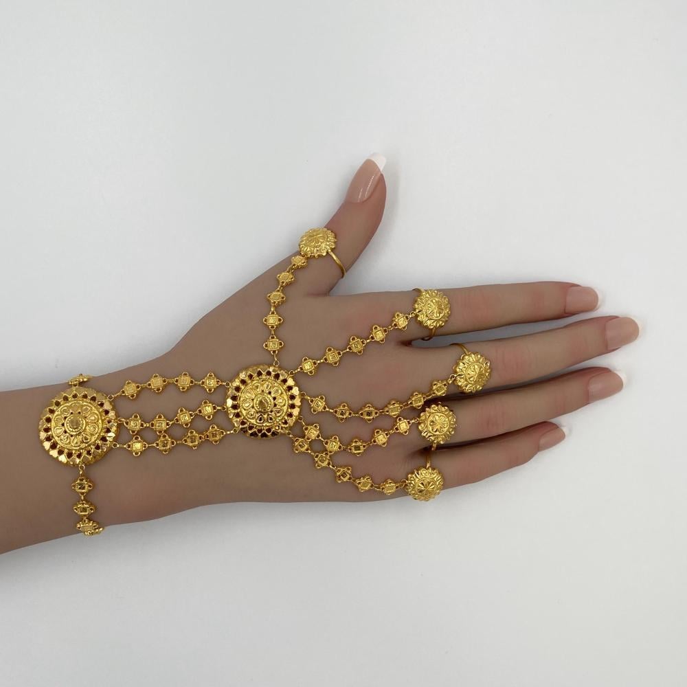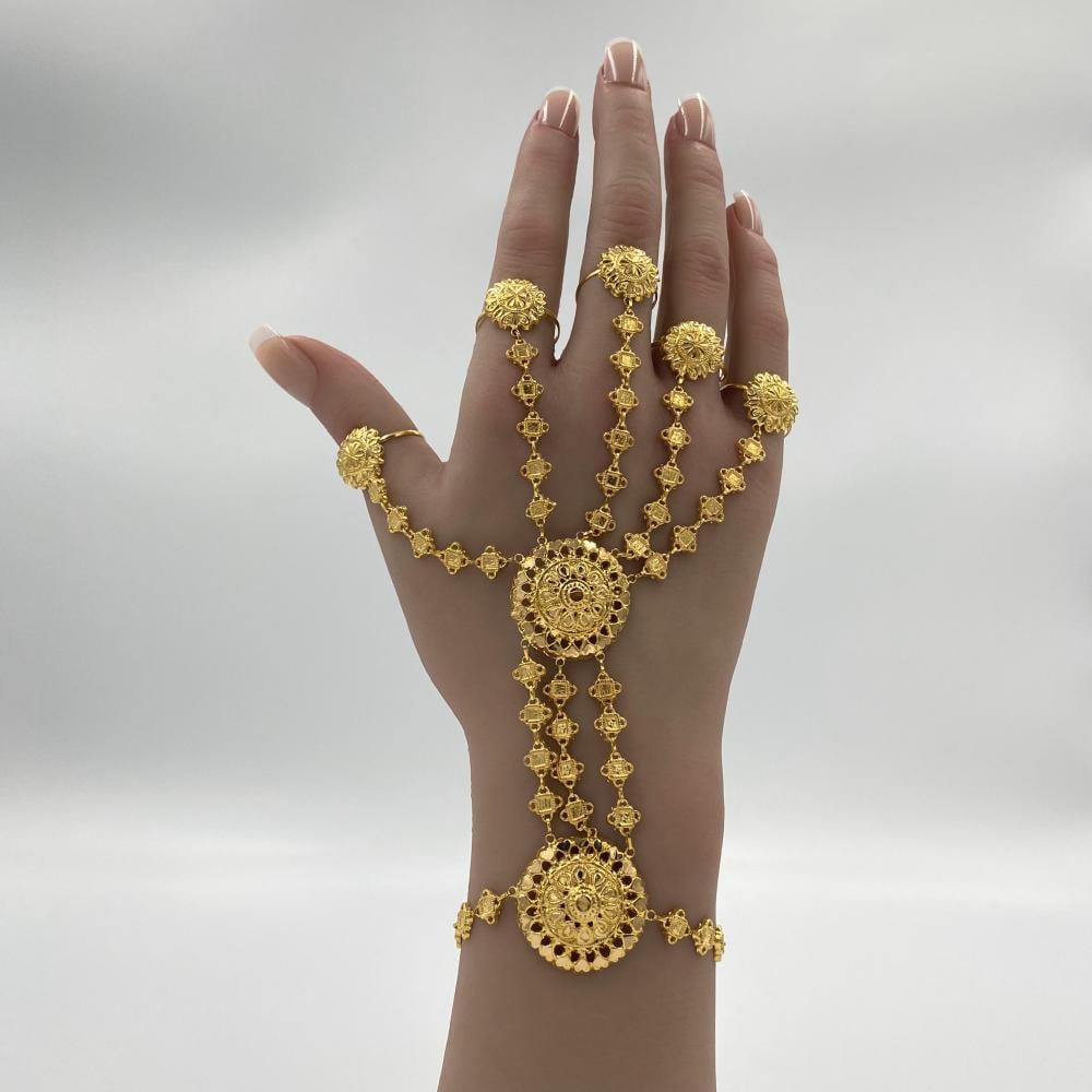 يقدم كف ذهب عيار 21 خمسة خواتم تصميمًا مميزًا بوزن 12.1 جرام ليكون قطعة مثالية لأي مناسبة. تقدم هذه القطعة مزيجًا رائعًا من الحداثة والكلاسيكية. هذه القطعة مثالية لإطلالة تجذب الأنظار في كل مناسبة.